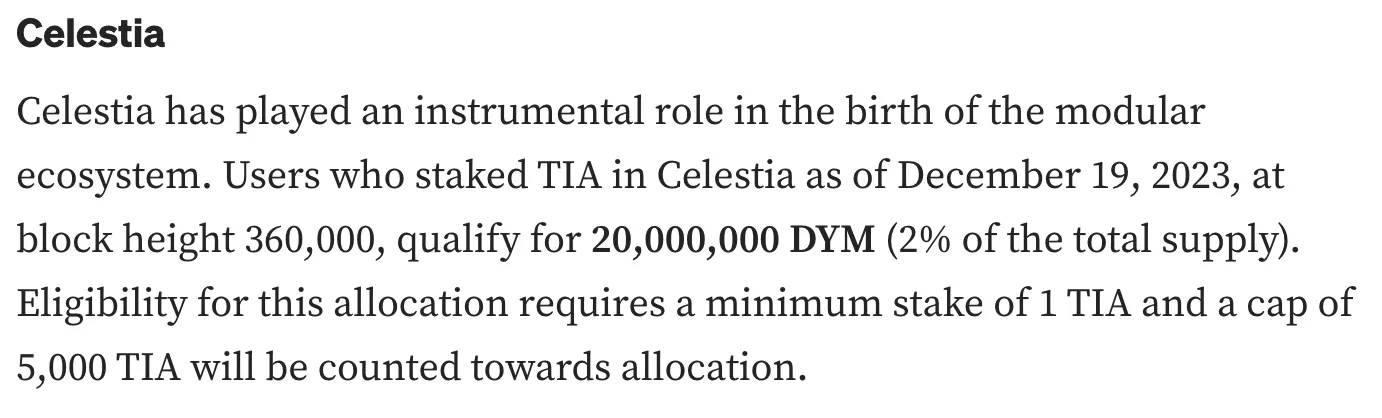 최근 에어드랍을 발표한 디멘션($DYM)은 IBC 생태계 내 셀레스티아에 대한 에어드랍 물량을 할당